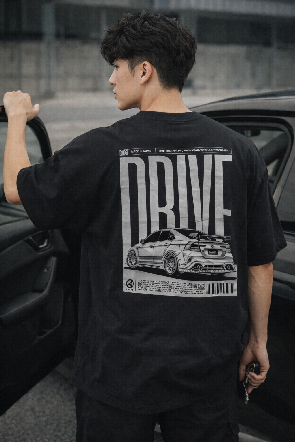 A modern streetwear look featuring an oversized black T-shirt with a bold automotive-inspired back print. The design showcases a detailed illustrated sports sedan paired with the word “DRIVE” in large vertical typography, creating a strong statement aesthetic. Subtle technical-style text elements, barcode detailing, and “Made in Japan” inspiration add a motorsport and drift culture vibe.