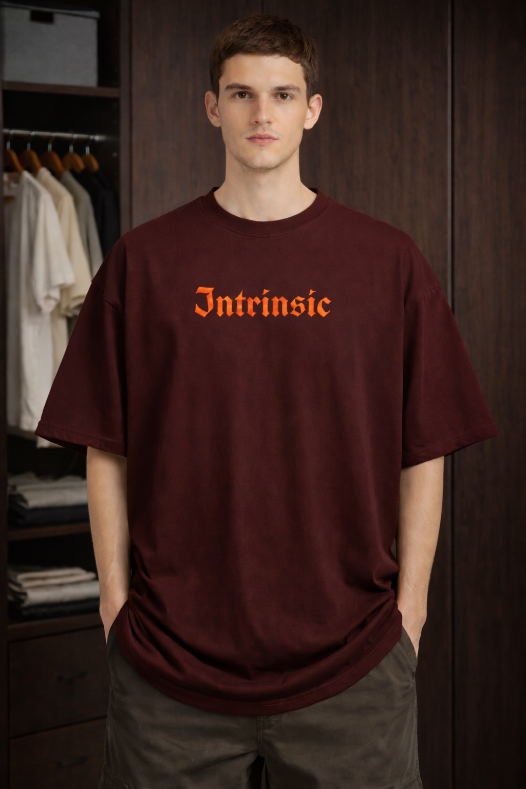 The INTRINSIC Oversized T-Shirt is crafted for those who believe strength comes from within. Featuring a subtle gothic-style “Intrinsic” print on the front and a bold, high-impact back graphic with a flaming classical statue, this piece blends modern streetwear with timeless symbolism.